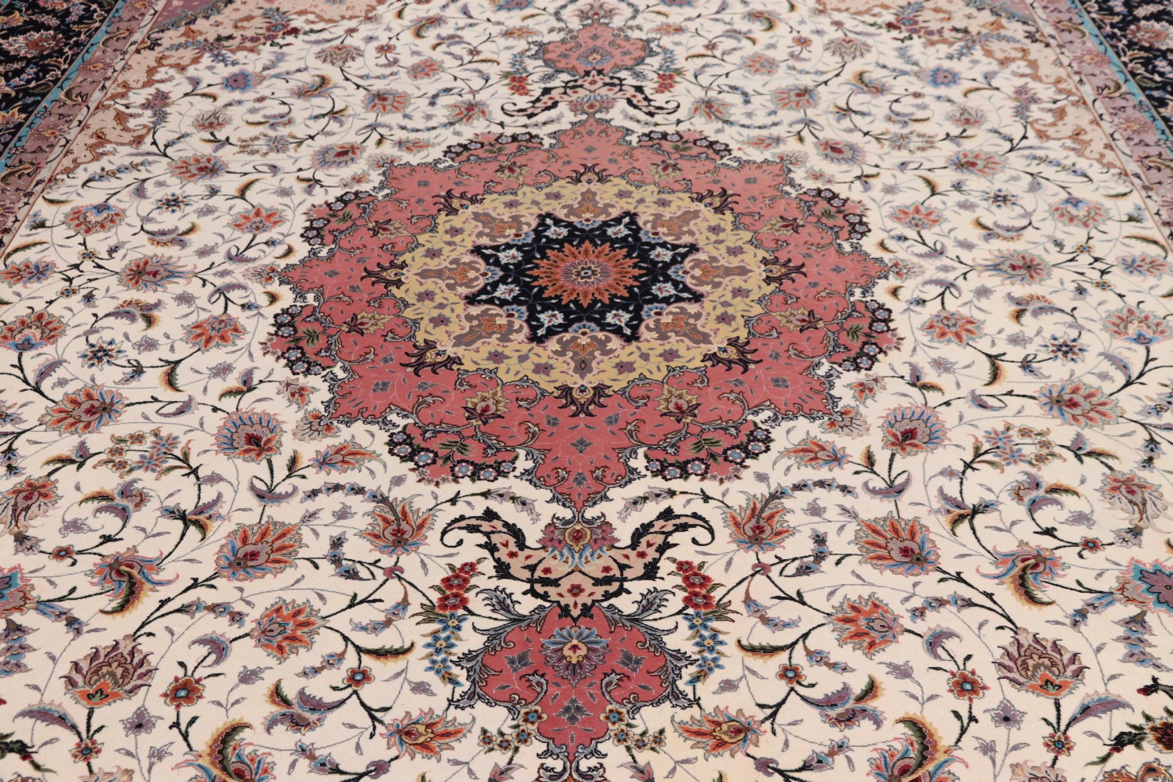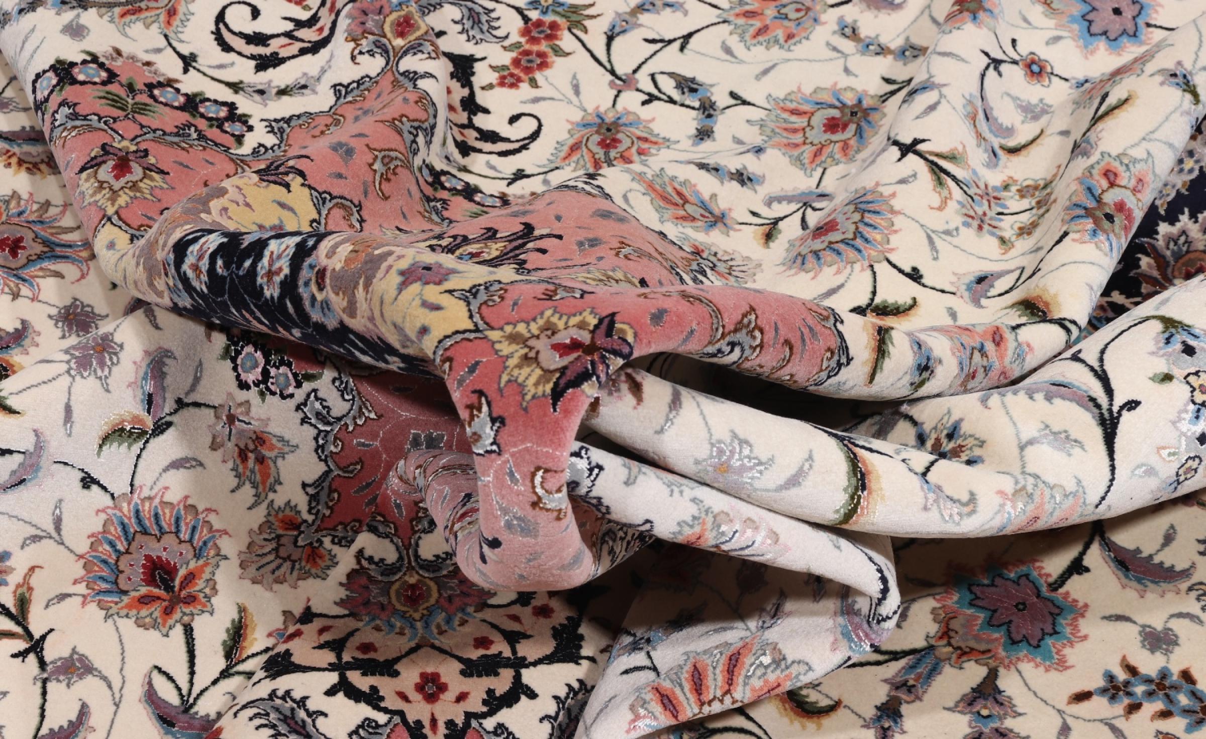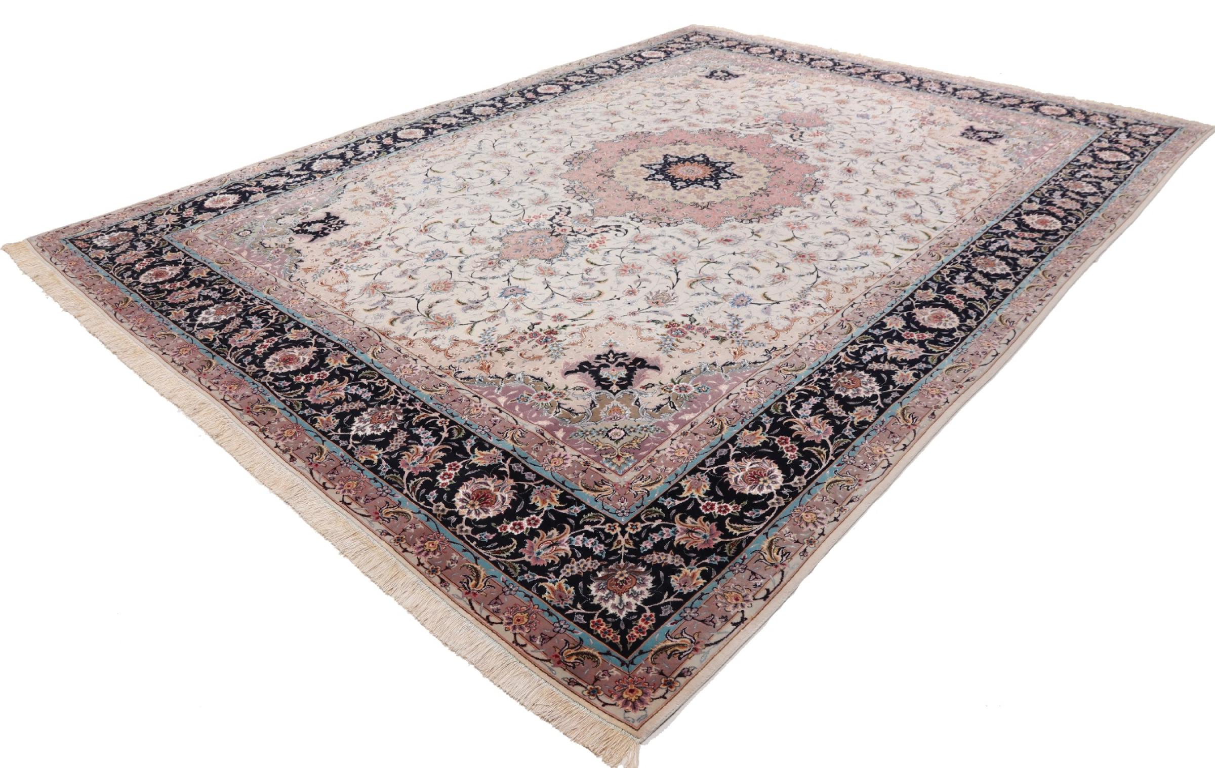 Carpet ID: 291970003759485 Size: 407x291 cm Thickness: ap. 7 mm Knot density: 600 000 / m² Manufacturing: Knotted by hand Pile: Wool with silk Warp: Cotton Origin: Persia Age: New Weight: ap. 36 kg Also know as Tabriz, Tabris, Täbris, Tebriz, Tebris, 40Raj, 50Raj In stock: Unique - Only 1 in stock