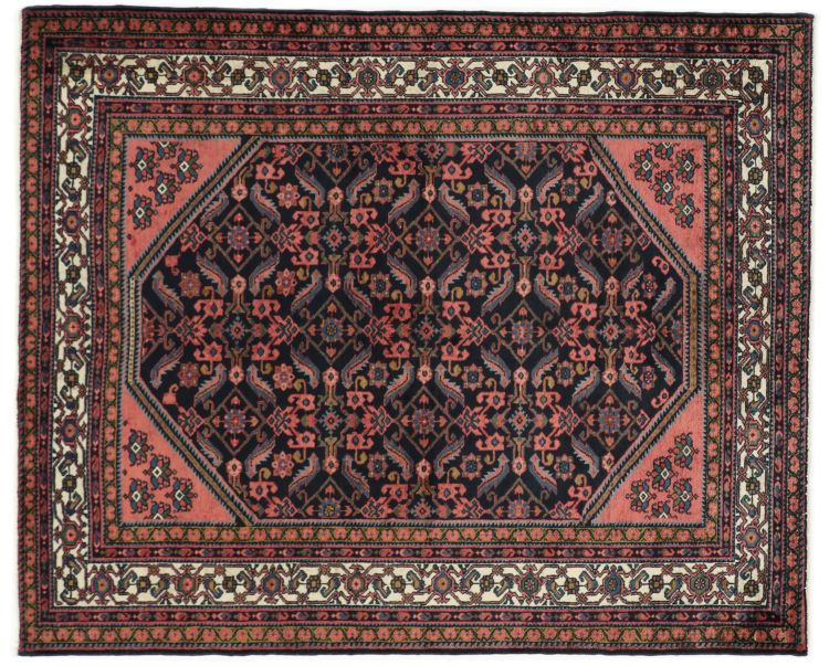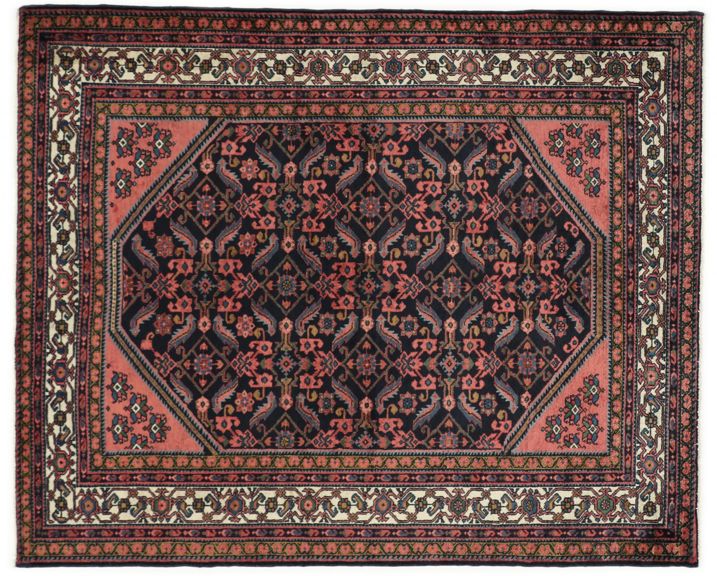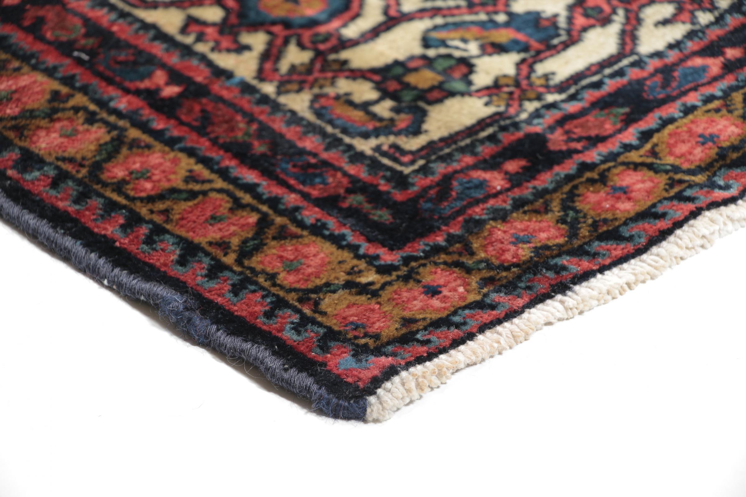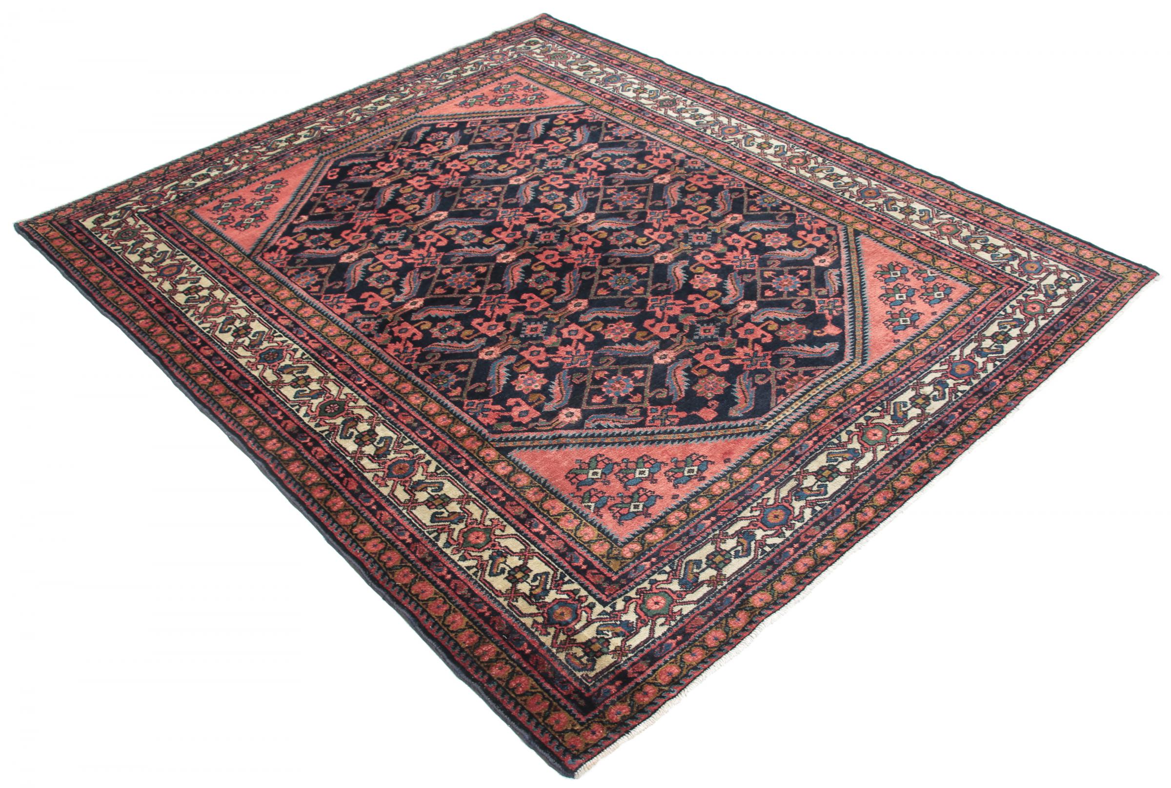 Carpet ID: 143851009245574 Size: 201x164 cm Thickness: ap. 10 mm Knot density: 200 000 - 250 000 / m² Manufacturing: Knotted by hand Pile: Handspun wool Warp: Cotton Origin: Persia Age: Old, 30-50 years Weight: ap. 10 kg In stock: Unique - Only 1 in stock