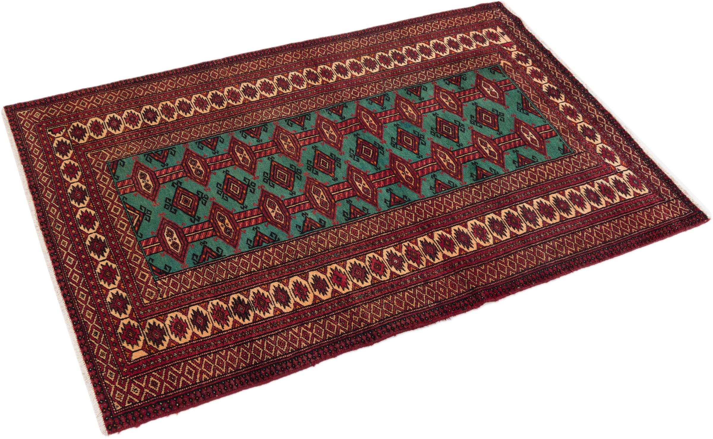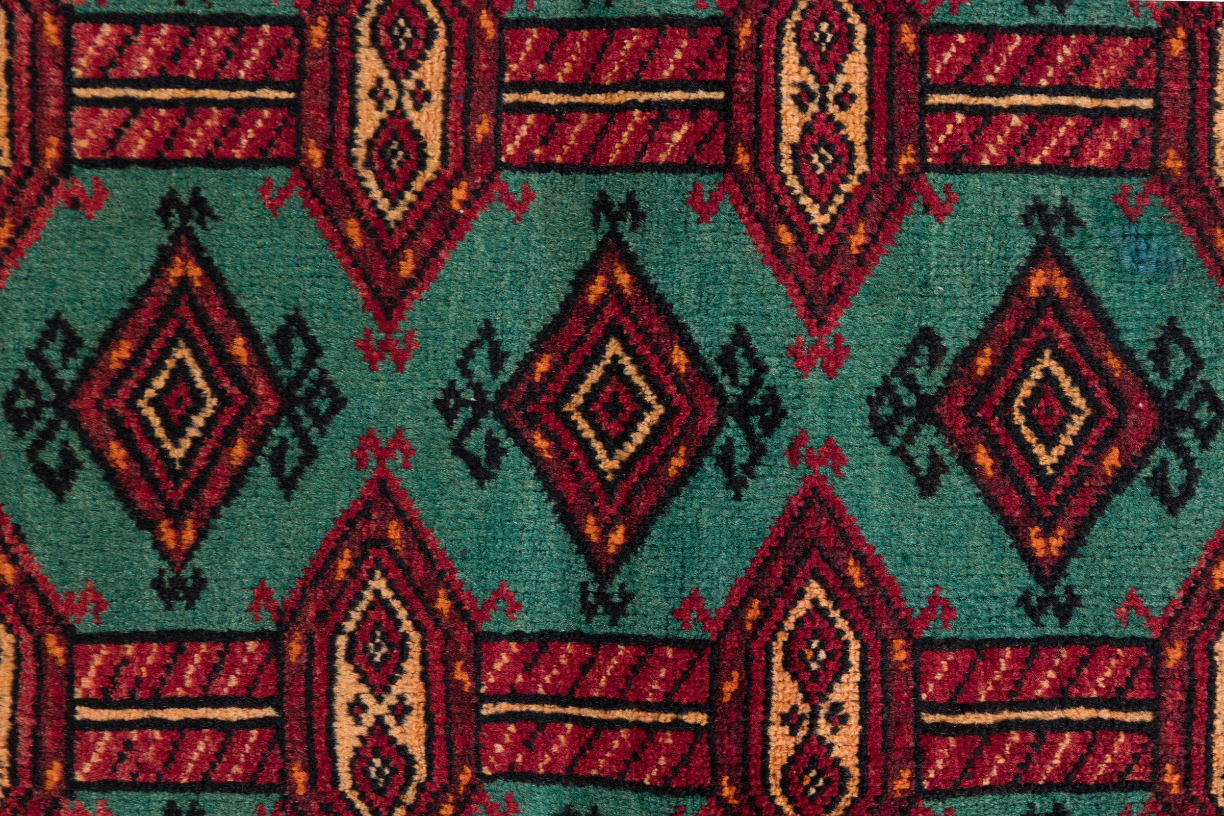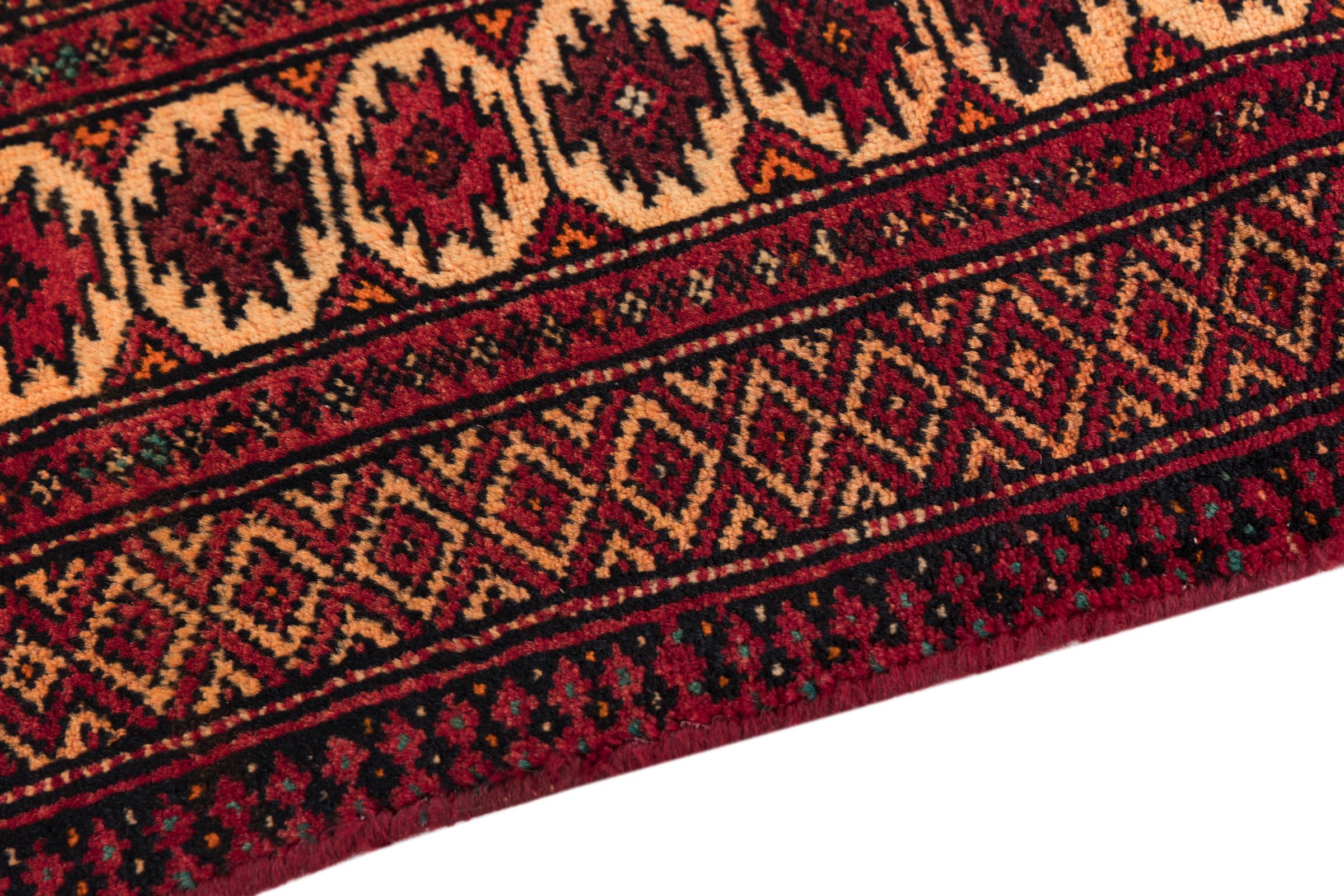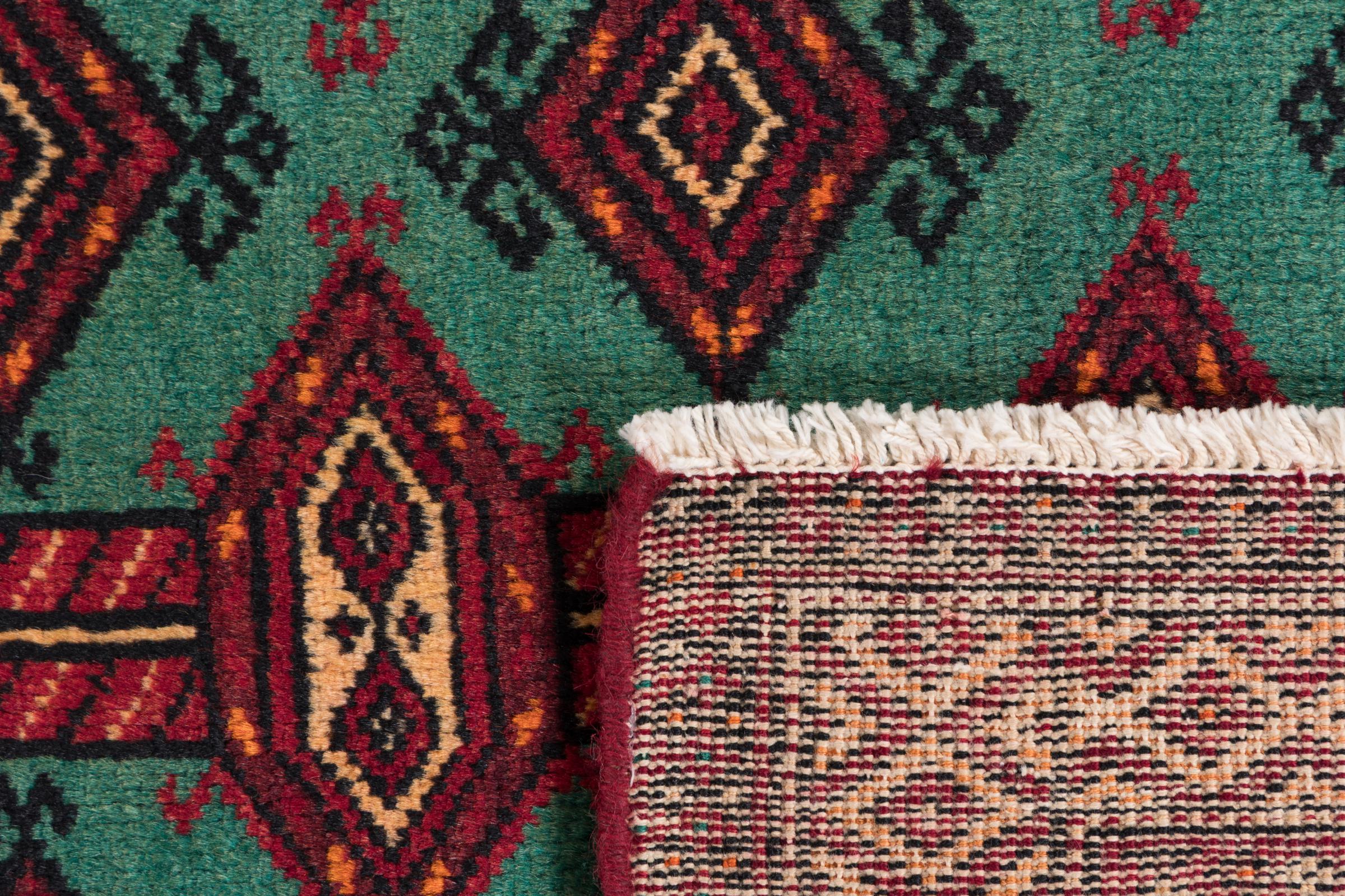 This Turkaman rug was knotted in traditional handicraft and convinces with its high production standard and the high-quality sheep's wool with high fat content. Its dark, warm colours reflect the Turkmen culture and add a touch of orient and cosiness to your home. Pakistani carpets often resemble this type of carpet, but often fail to match its quality.