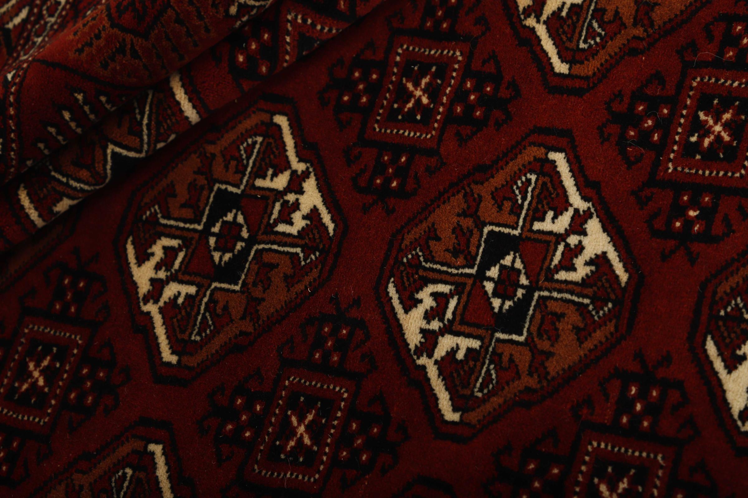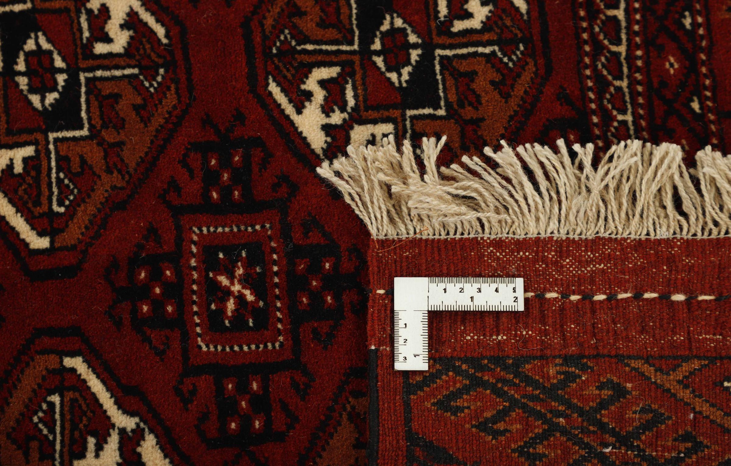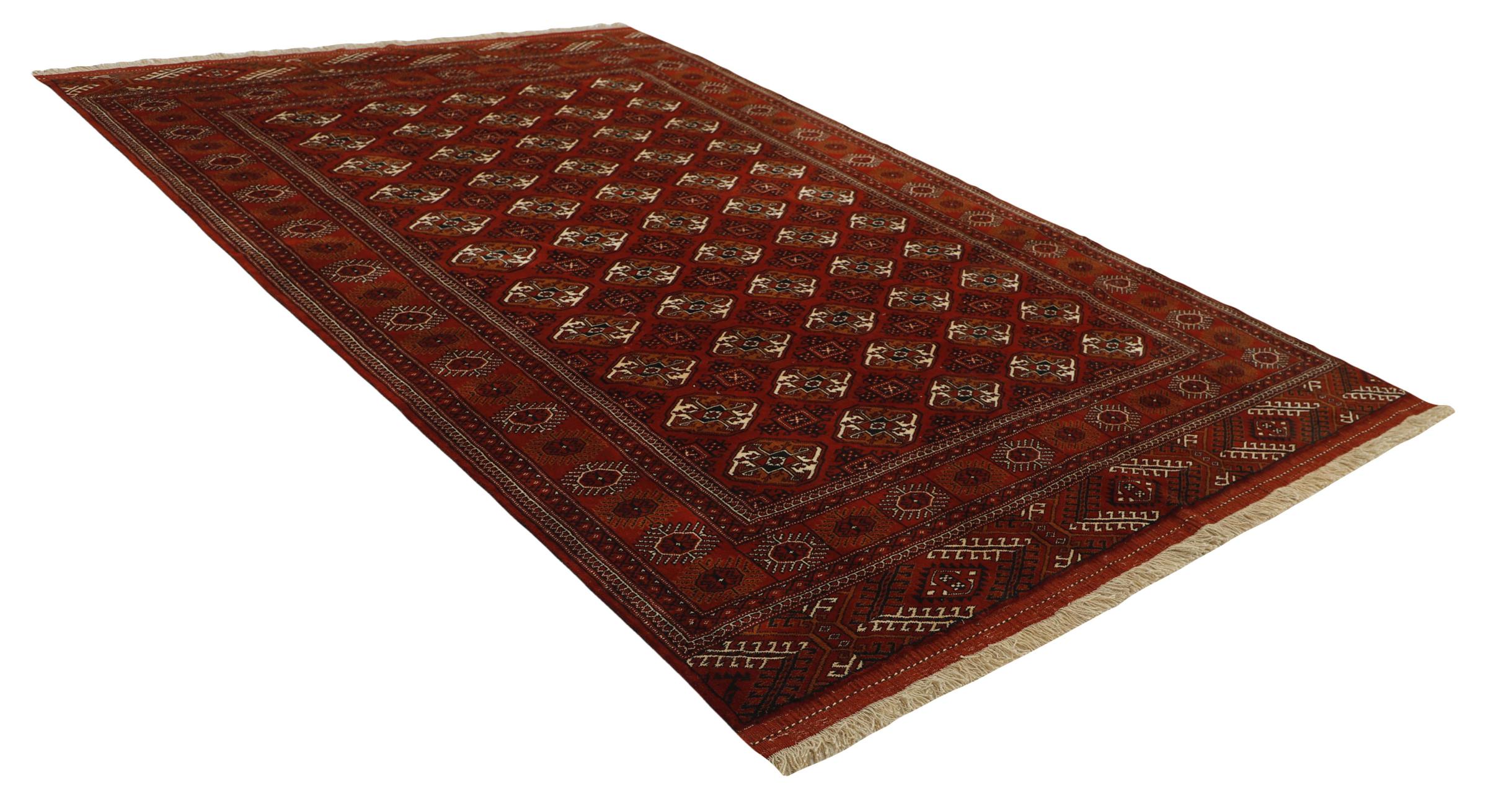 This Turkaman rug was knotted in traditional handicraft and convinces with its high production standard and the high-quality sheep's wool with high fat content. Its dark, warm colours reflect the Turkmen culture and add a touch of orient and cosiness to your home. Pakistani carpets often resemble this type of carpet, but often fail to match its quality.
