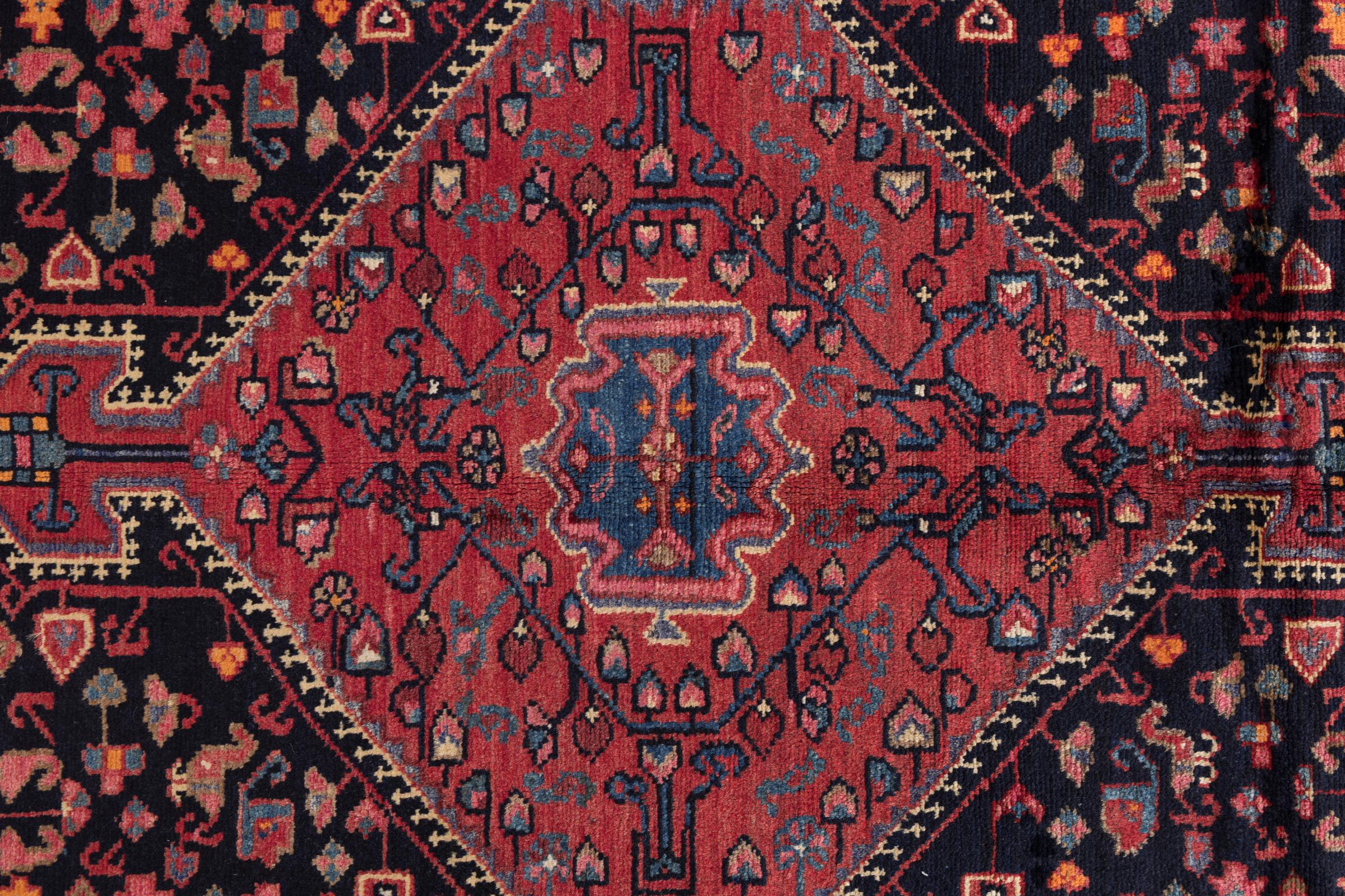 This rug belongs to village and nomadic rugs from Iran, formerly Persia. This type of rug is knotted by hand in smaller towns and villages in old tradition. Even nomads still knot Persian rugs in the open air. The rugs are knotted without a draft and completely from the mind. They are characterized by classical ornaments, which are arranged in straight and geometrical patterns. Thanks to their cultural-traditional origin, these rugs have a unique character that embodies ancient Persia.