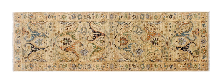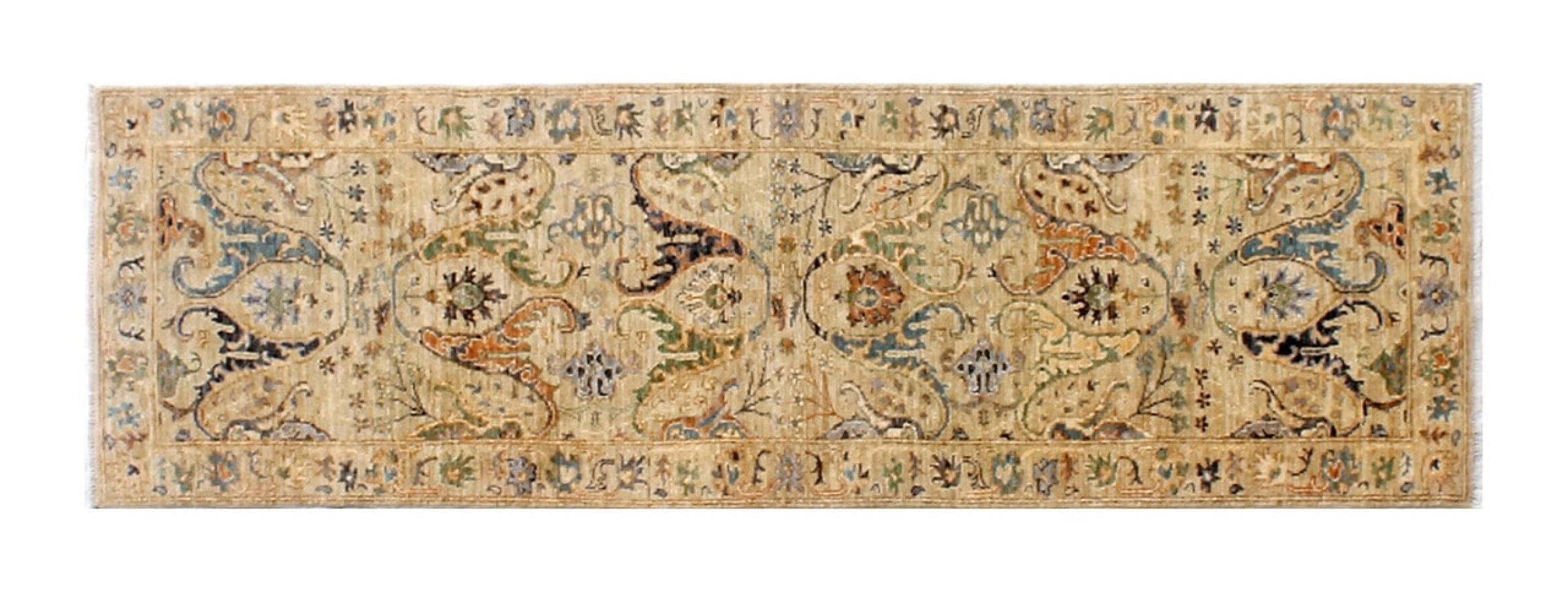 Carpet ID: 283339009842879 Size: 289x85 cm Thickness: ap. 6 mm Knot density: 120 000 - 150 000 / m² Manufacturing: Knotted by hand Pile: Handspun wool Warp: Cotton Origin: Afghanistan Age: New Weight: ap. 9 kg Also know as Ushak, Oushak In stock: Unique - Only 1 in stock