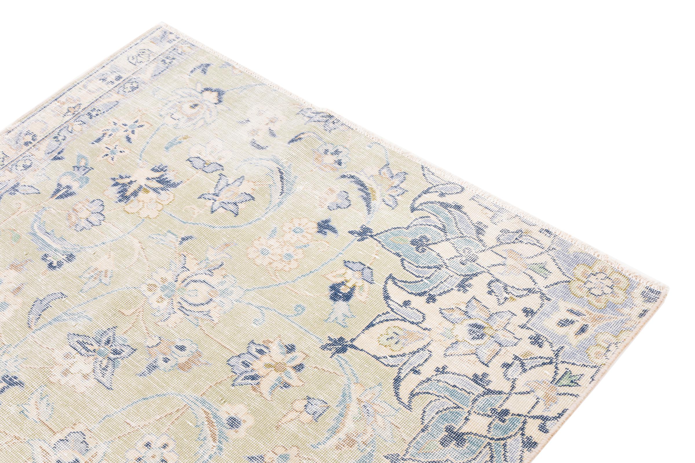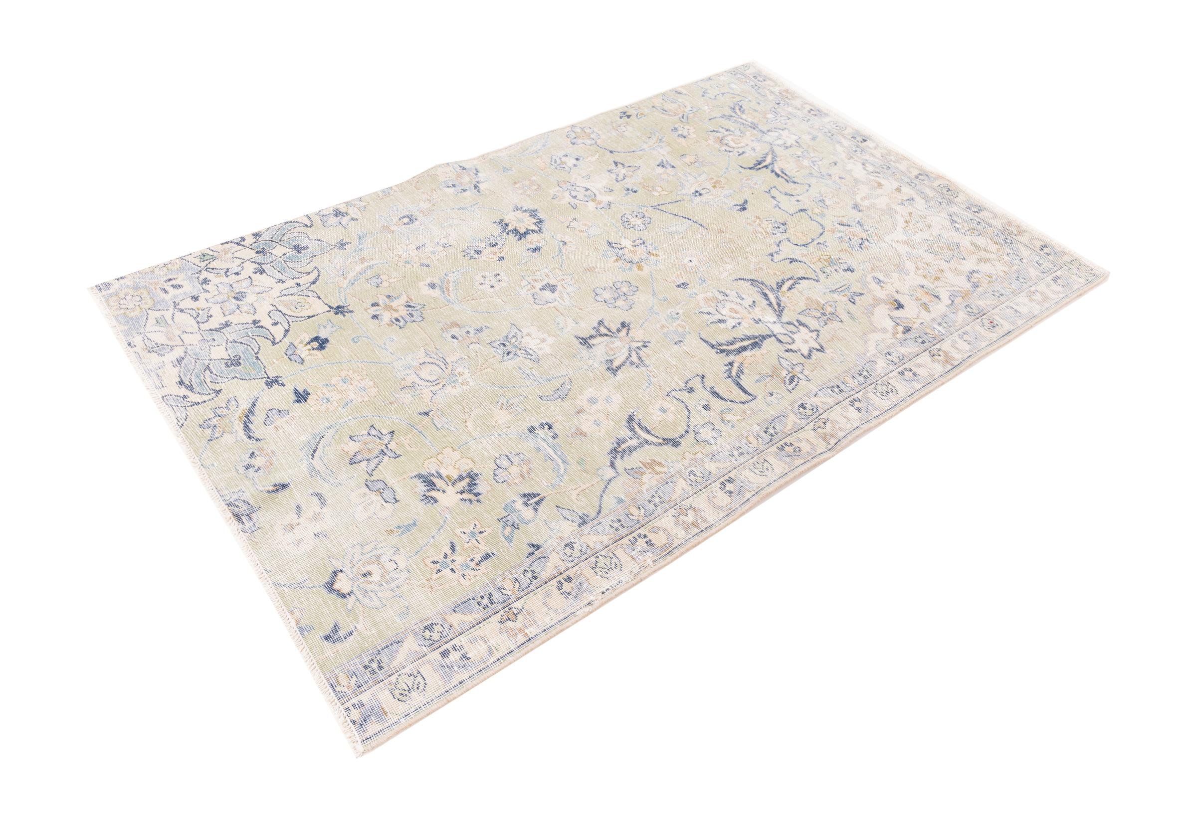 This is a hand-knotted Persian carpet that is at least 20 years old. Such a carpet can last for generations with the right care. The carpet has been completely re-dyed without completely over-dyeing the originally knotted ornaments. This gives the high quality Persian carpet a unique modern vintage character.