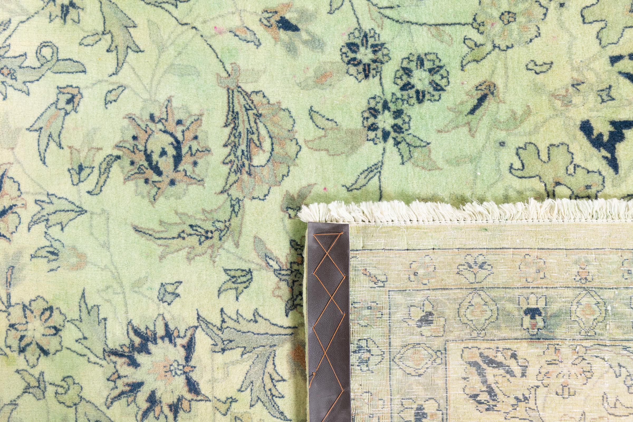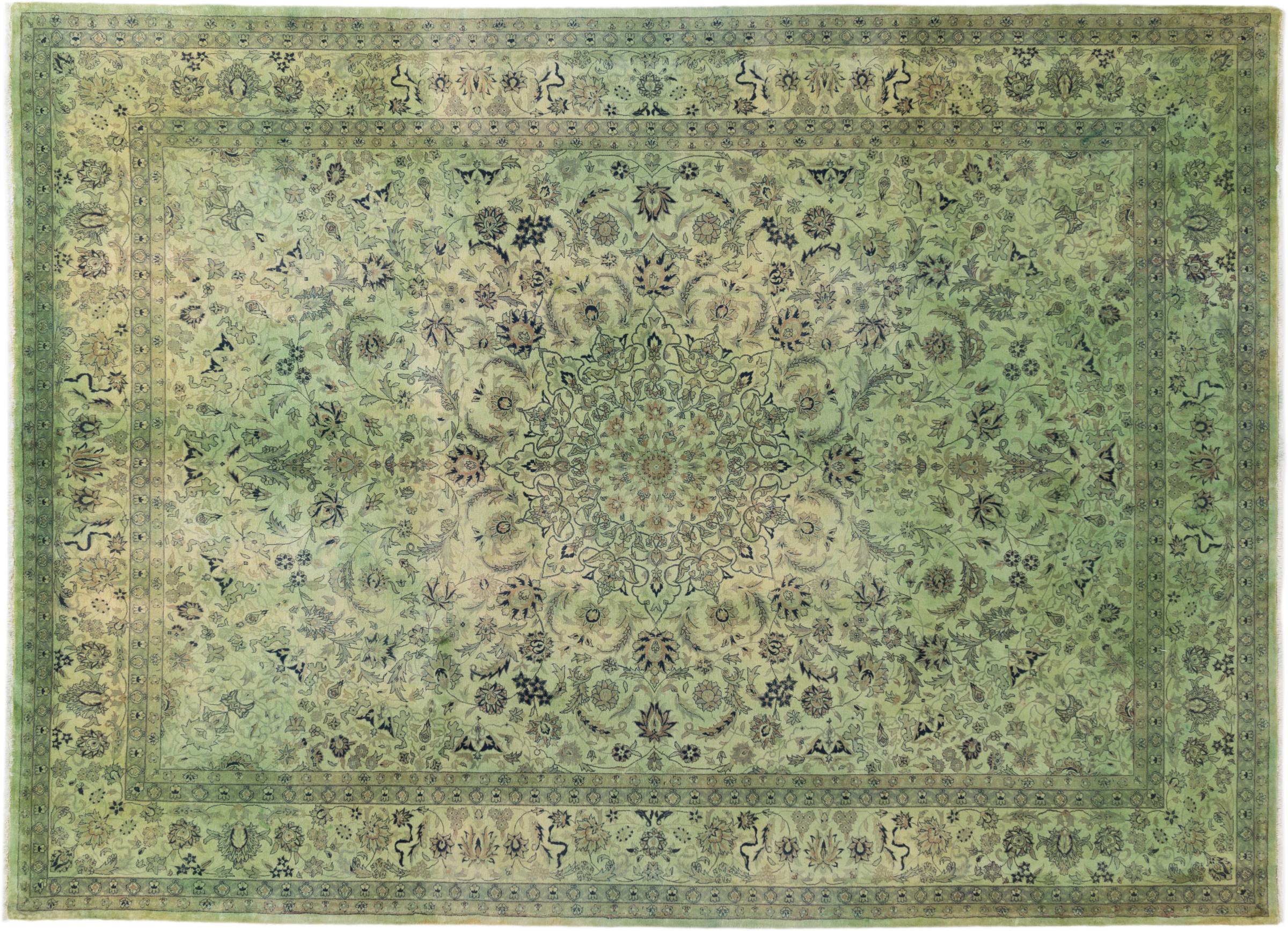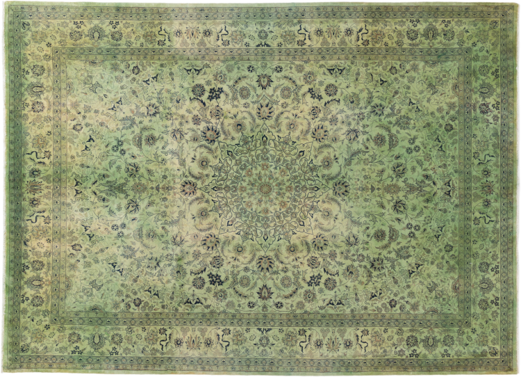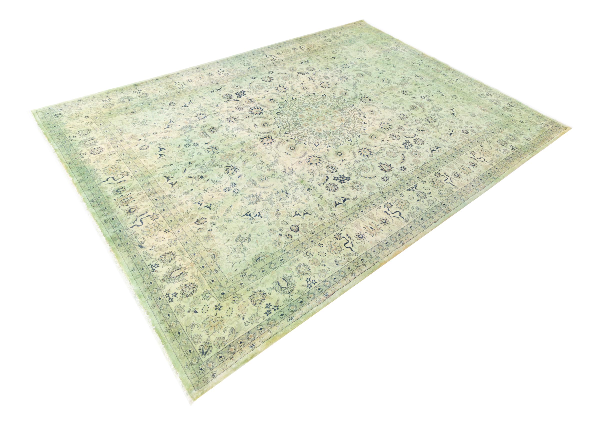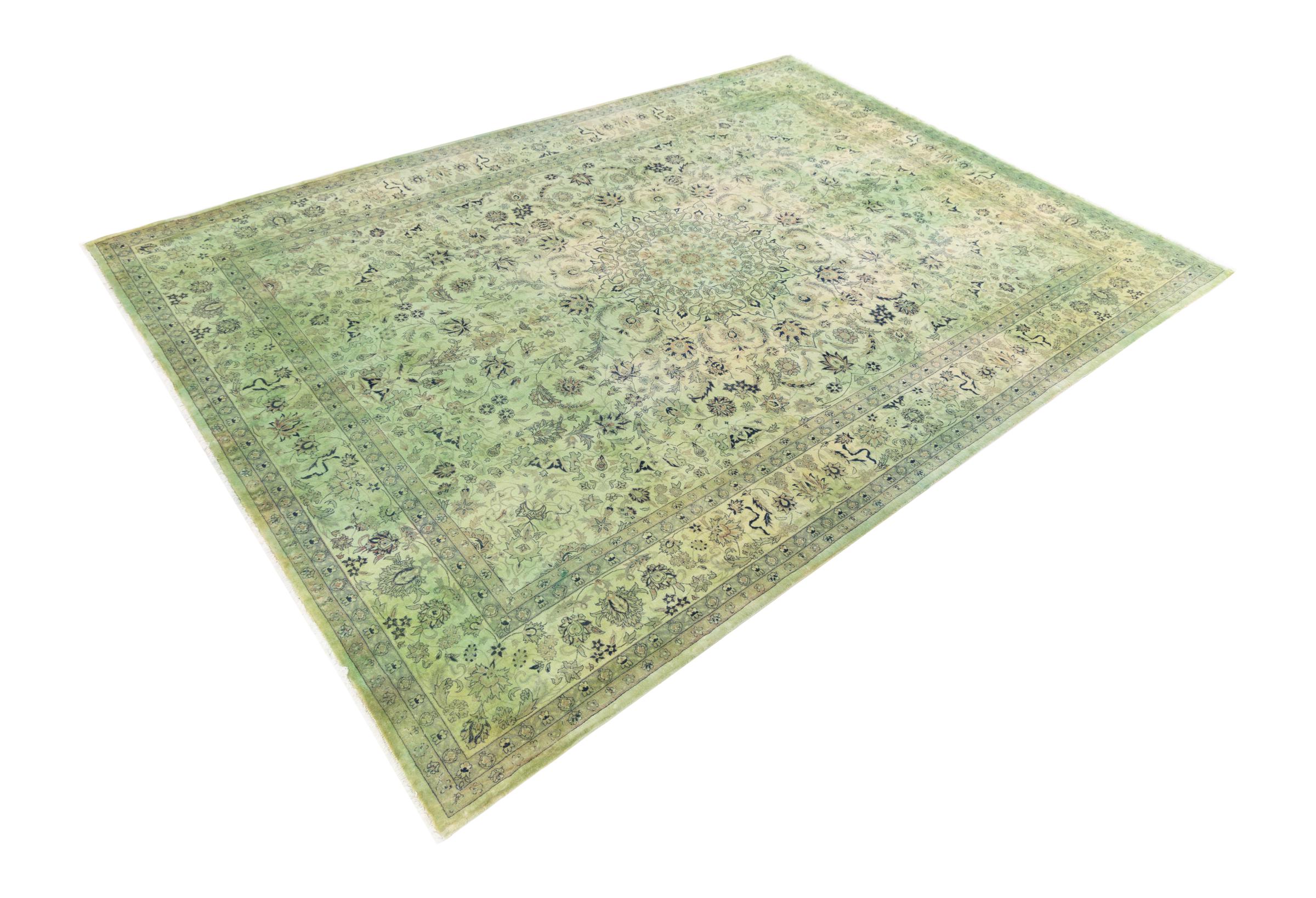 This is a hand-knotted Persian carpet that is at least 20 years old. Such a carpet can last for generations with the right care. The carpet has been completely re-dyed without completely over-dyeing the originally knotted ornaments. This gives the high quality Persian carpet a unique modern vintage character.