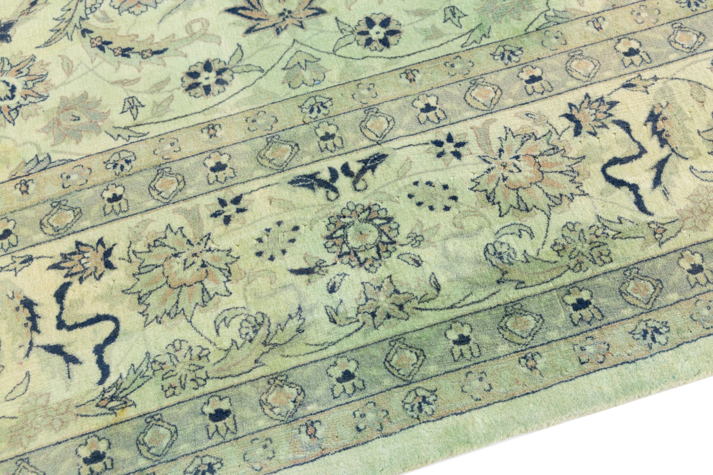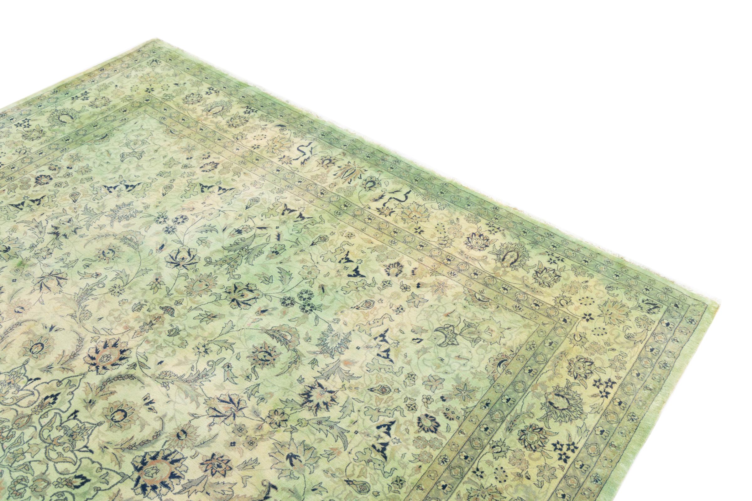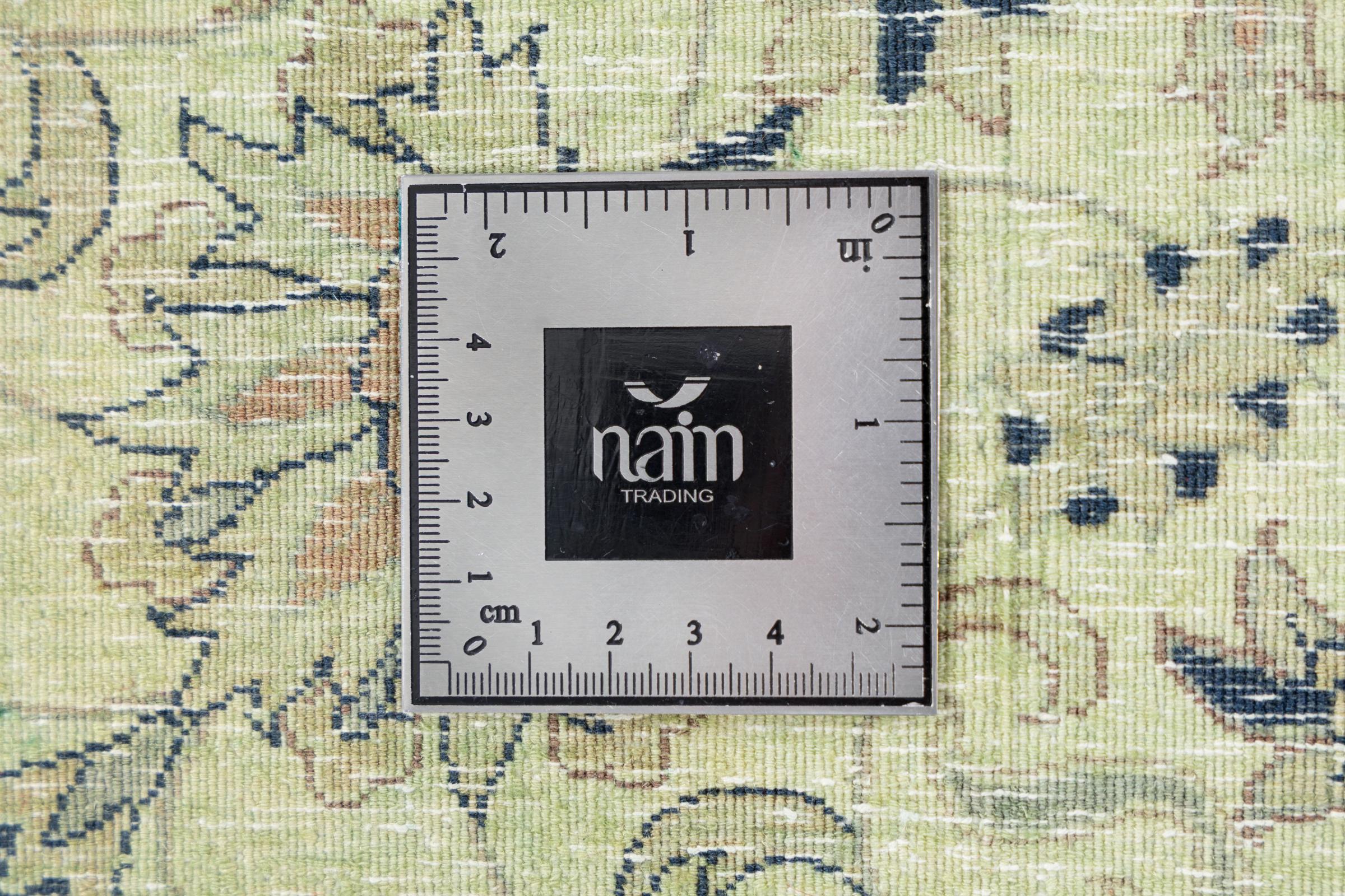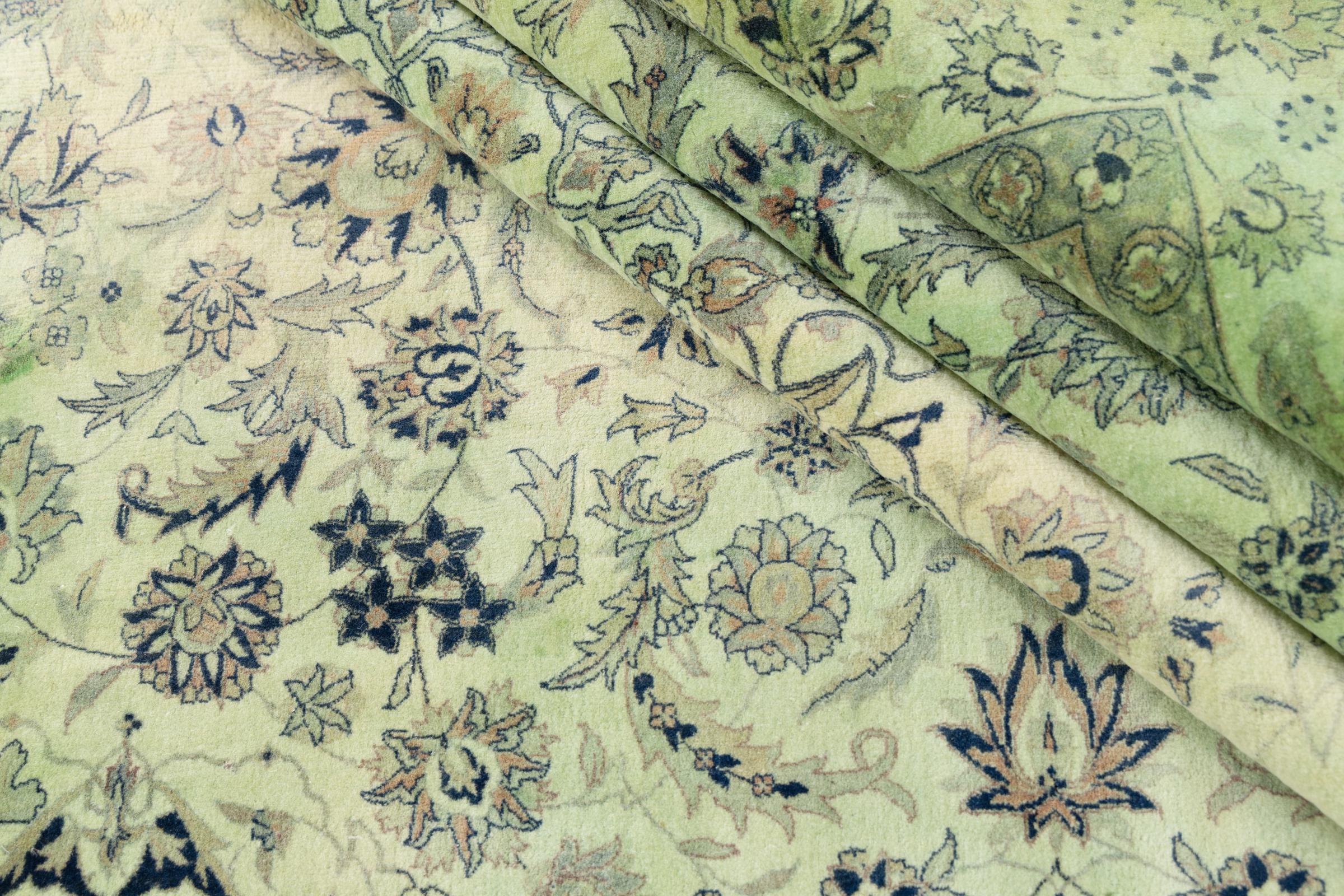 This is a hand-knotted Persian carpet that is at least 20 years old. Such a carpet can last for generations with the right care. The carpet has been completely re-dyed without completely over-dyeing the originally knotted ornaments. This gives the high quality Persian carpet a unique modern vintage character.