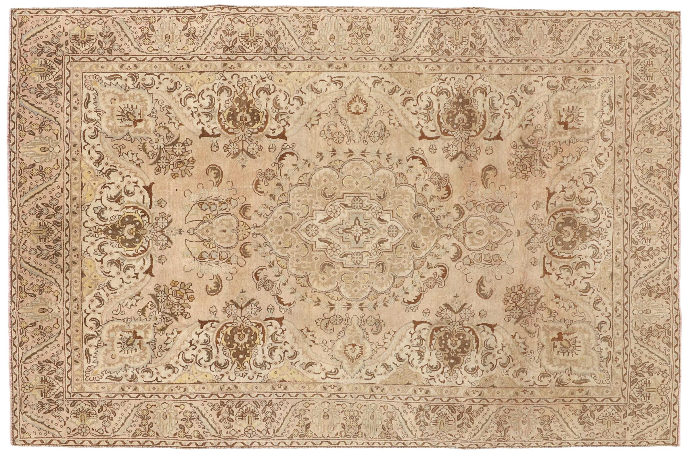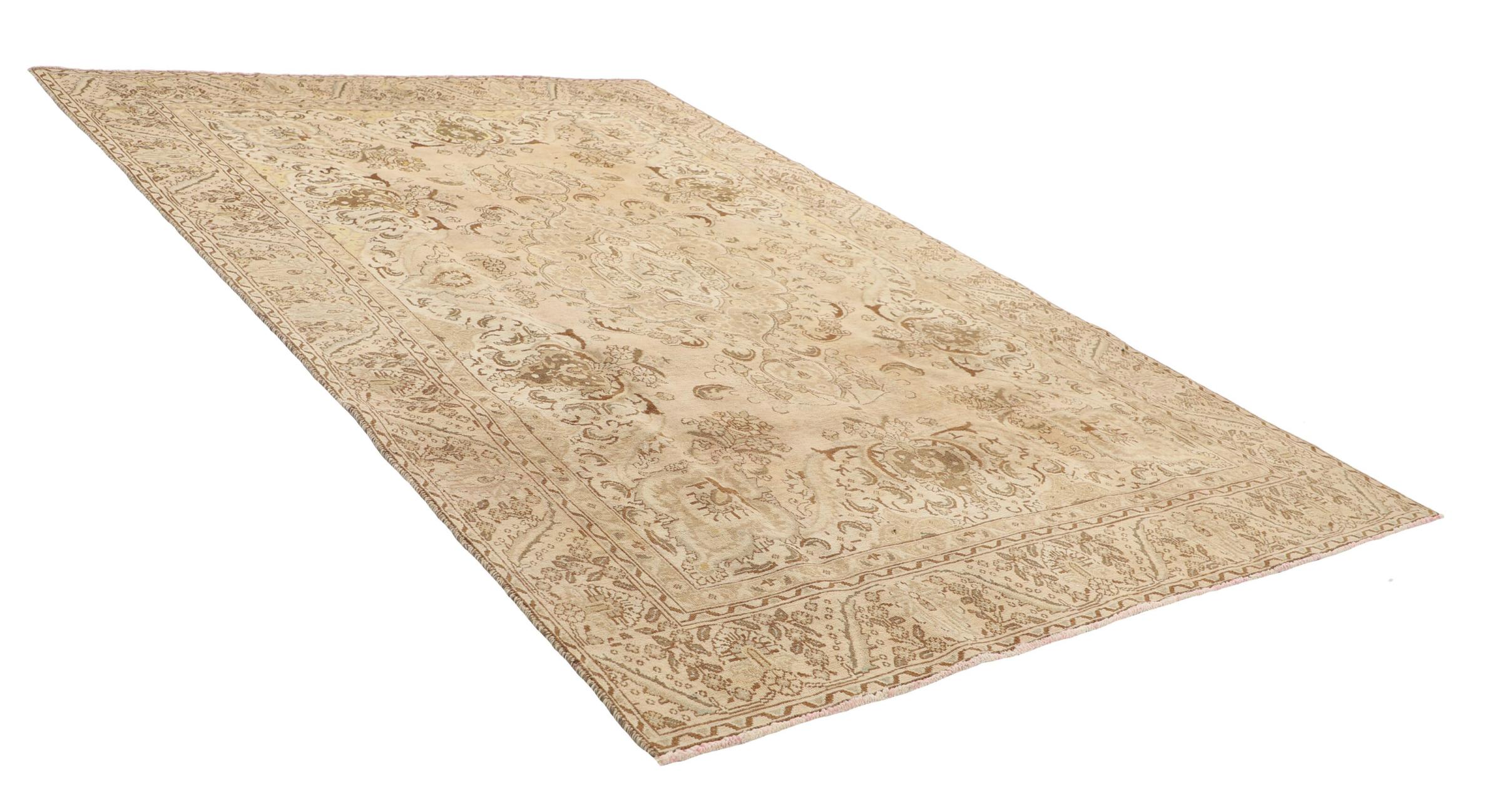 This is a hand-knotted Persian carpet that is at least 20 years old. Such a carpet can last for generations with the right care. The carpet has been completely re-dyed without completely over-dyeing the originally knotted ornaments. This gives the high quality Persian carpet a unique modern vintage character.