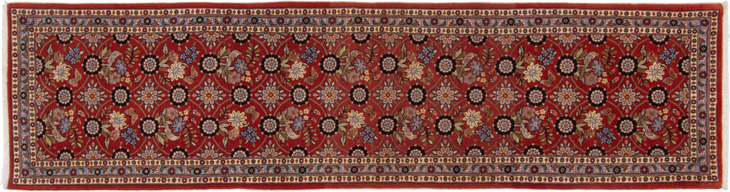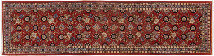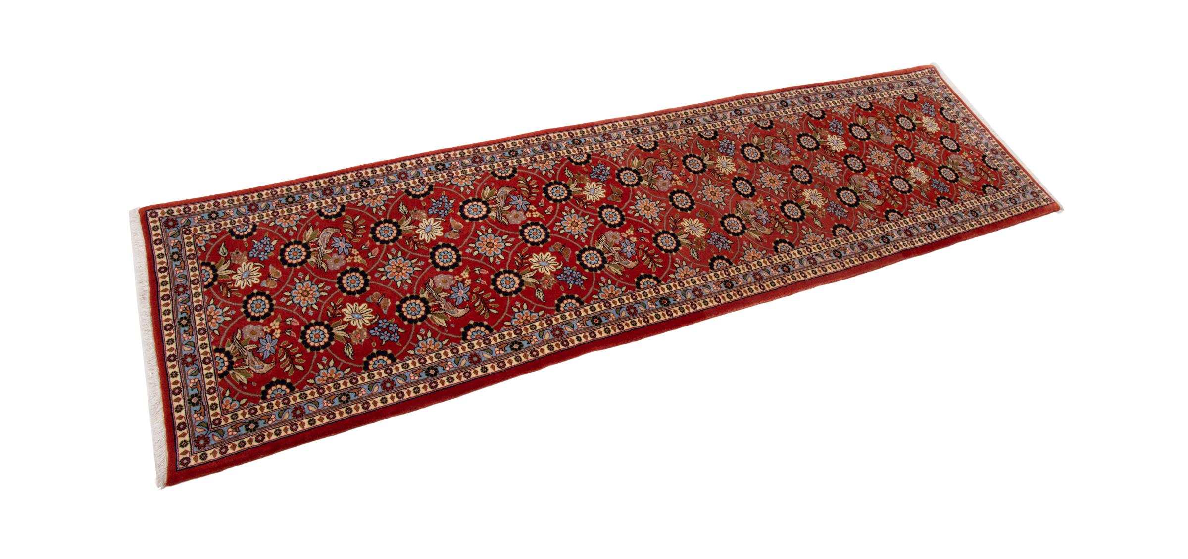 Carpet ID: 292814005335616 Size: 299x78 cm Thickness: ap. 12 mm Knot density: 320 000 - 360 000 / m² Manufacturing: Knotted by hand Pile: Wool with silk Warp: Cotton Origin: Persia Age: New Weight: ap. 8 kg In stock: Unique - Only 1 in stock